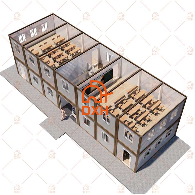 Os prédios escolares em contêineres pré-fabricados da DXH House oferecem espaços de aprendizagem e escritórios prontos para uso para alunos e educadores. Nossas estruturas pré-fabricadas em contêineres eliminam os longos ciclos de construção e as interrupções no canteiro de obras associados às construções tradicionais. A DXH House oferece dois tamanhos padrão de casas em contêineres: 6 ou 12 metros, e também oferecemos layouts de contêineres personalizáveis. Nosso compromisso com o serviço é fornecer a você um prédio escolar modular em contêineres, de rápida implantação, durável e de alta qualidade.